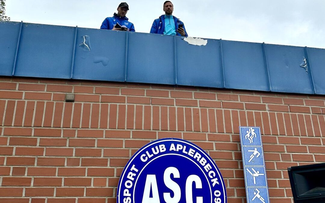 Als der gute Schiedsrichter Ali Magrouda die Partie im Urlaubsguru-Waldstadion nach 90+5 Minuten abpfiff, drehte sich Keanu Diskau zum Vereinsheim, richtete den Blick nach oben und reckte Marco Stiepermann und Justin Martin die geballte Faust entgegen (Foto unten). Trainer und Co-Trainer der Aplerbecker hatten die Partie vom Dach aus beobachtet (Foto oben). Beide waren gesperrt, weil sie beim 1:1 in Rheine nach dem Schlusspfiff die Rote Karte gesehen hatten. So führte Torwarttrainer David Ringel gegen Rhynern von der Bank aus Regie – und das offensichtlich sehr gut. Denn in einer Partie, die den Ansprüchen an ein Spitzenspiel vom Anpfiff an gerecht wurde, waren die Gastgeber griffig und konsequent. Da war viel Tempo im Spiel. Viel Dynamik. Beide Teams vermittelten klar den Eindruck: Wir wollen Fußball spielen. Nicht taktieren. Nicht mauern. Her mit dem Ball!